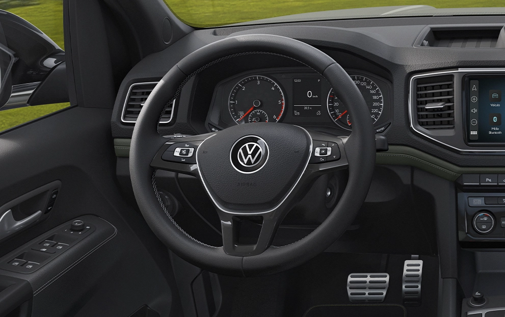 A Nova Amarok está mais bruta, renovada e imponente. O visual foi atualizado e a iluminação foi aprimorada, muito mais moderna e eficiente. A grade frontal iluminada (light strip) da Nova Amarok melhora a visibilidade em áreas de baixa luminosidade. Além disso, a picape tem faróis Full LED e rodas de liga leve 20”.